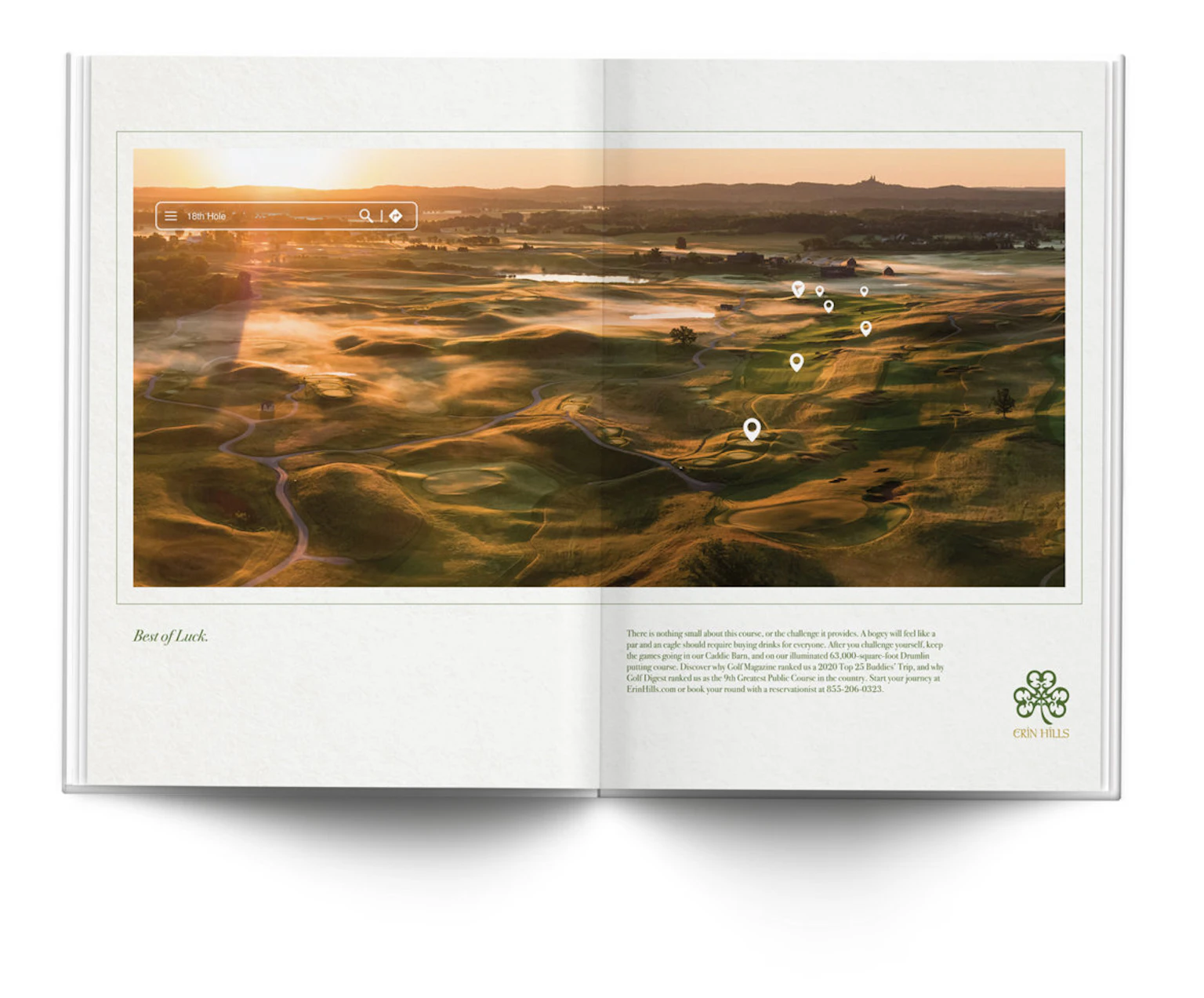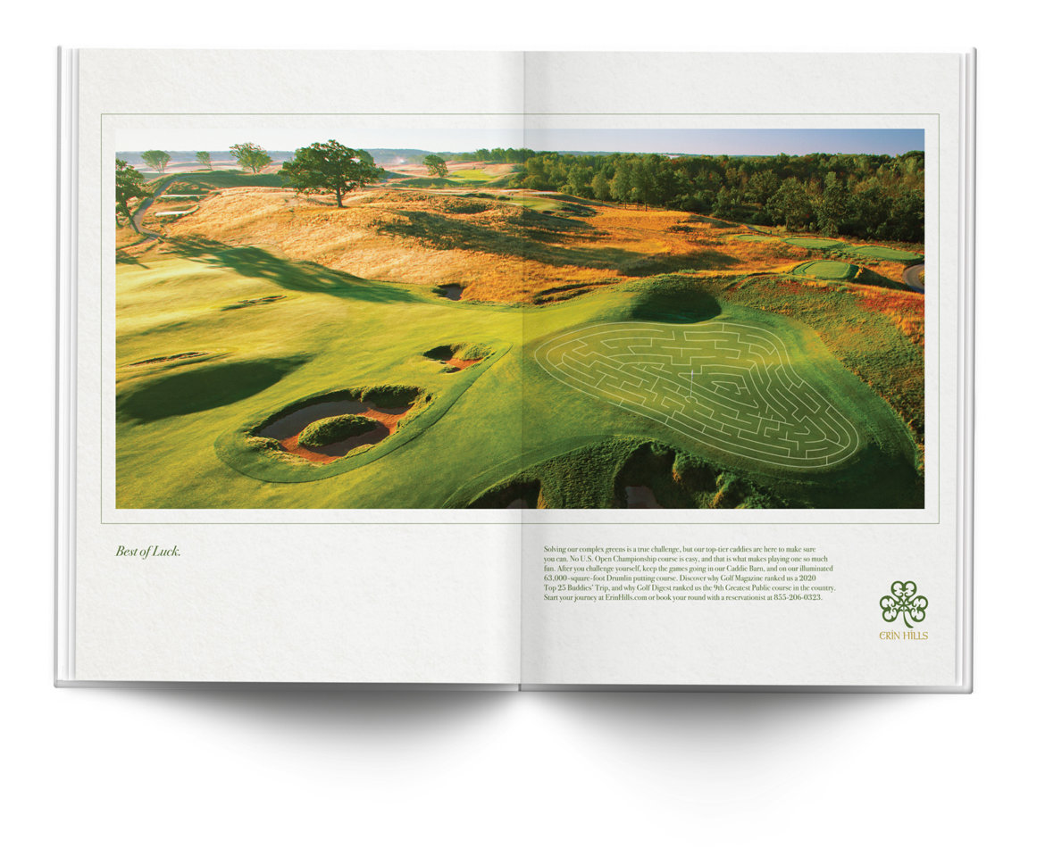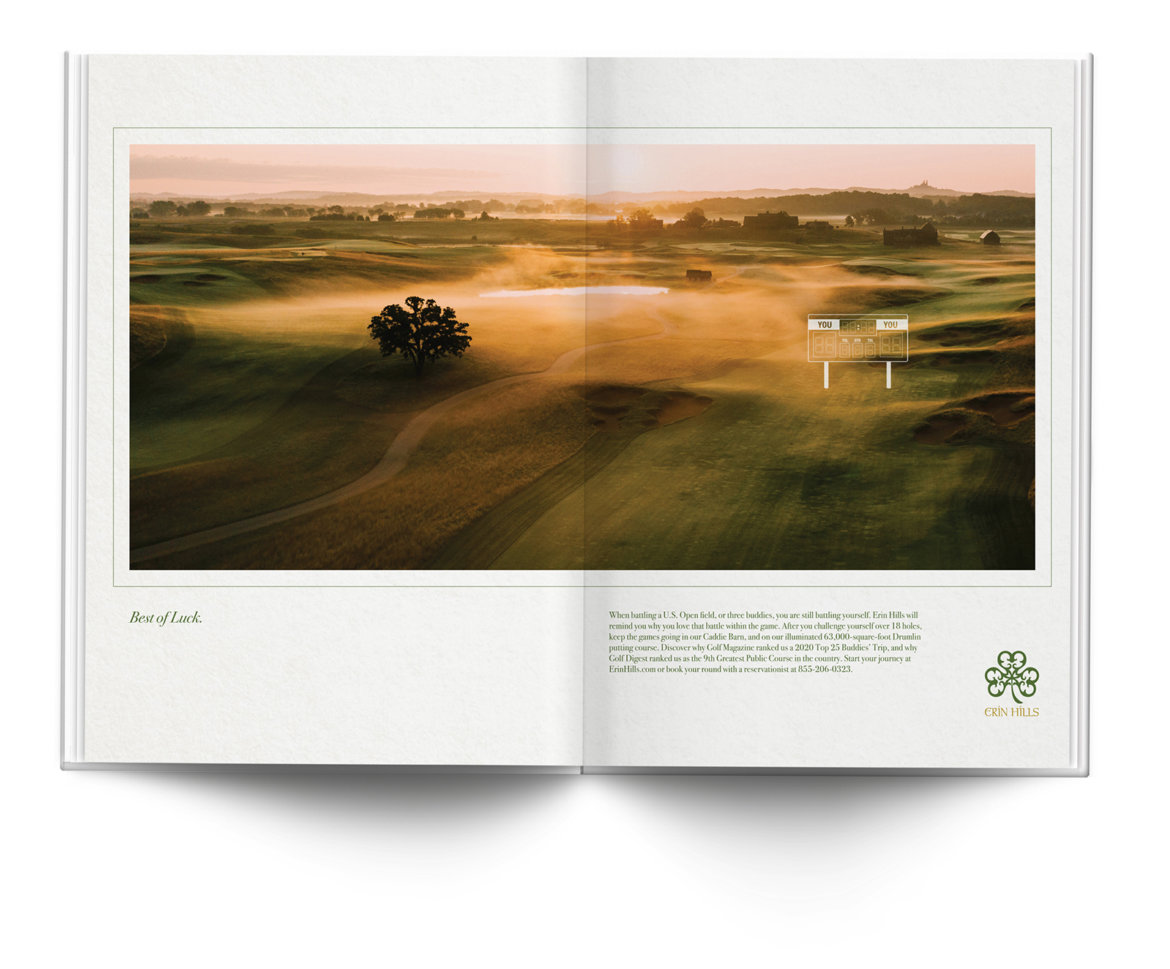 Erin Hills Golf Club, was the site of the 2017 US Open Championship for a reason. It is one of the most picturesque and demanding courses in the world. This campaign was placed in major golf magazines to remind people that both beauty and challenge make this golf course so special. “Best of Luck”.