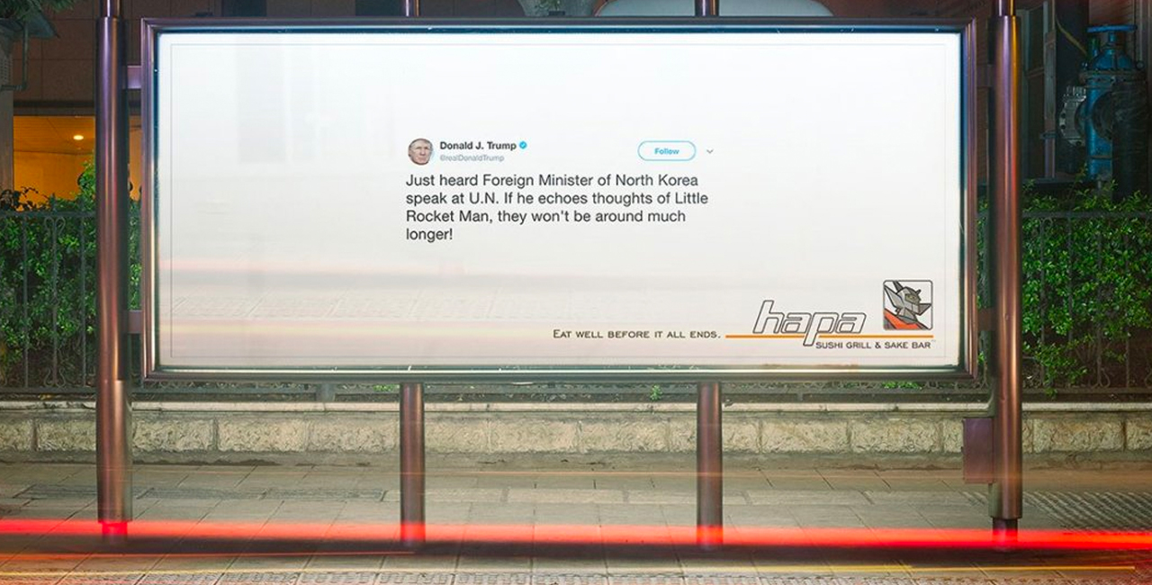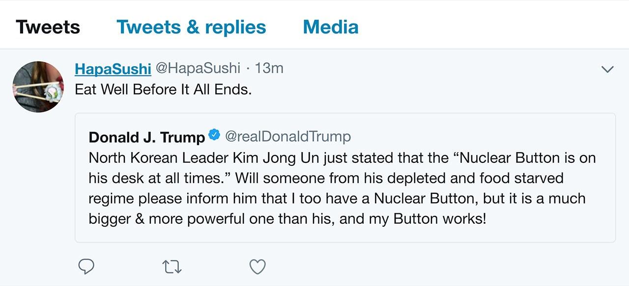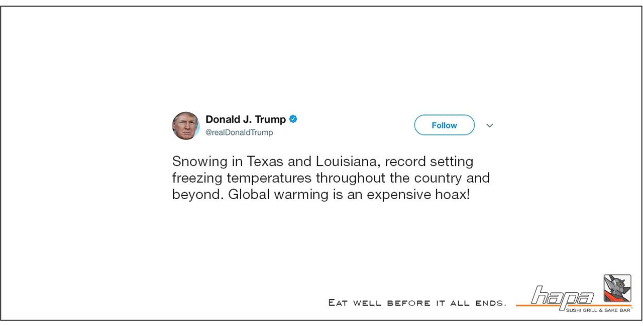 Unedited Trump tweets are a scary indication that the world as we know it might end under his power. We let him do most the talking on this one, and just encouraged everyone to eat some really good Hapa sushi before it’s all over.