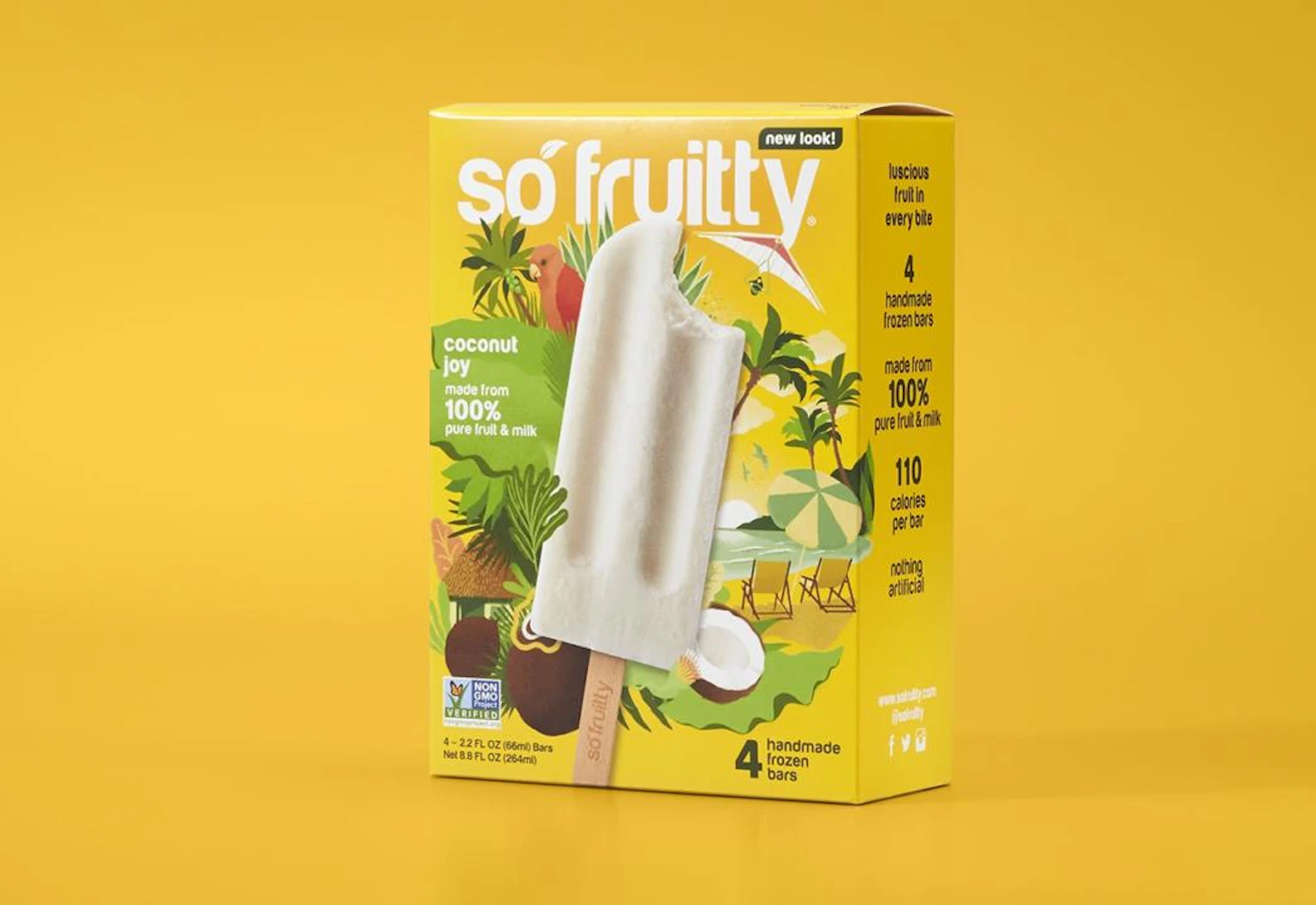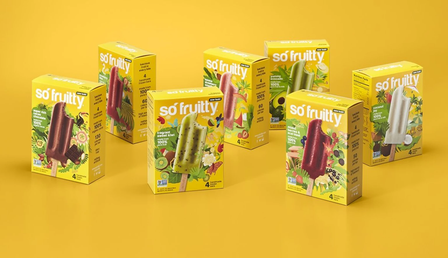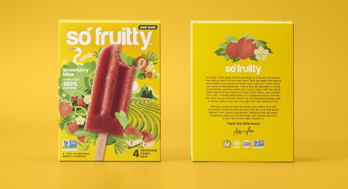 So Fruitty, a Florida-based frozen fruit bar company, came to us looking for help with a brand and packaging refresh. We set out to not only help their genuinely delicious bars stand out in a crowded market, but to embrace the Brazilian roots of their brand along the way. With the help of vibrant illustrations and a bold color scheme, we were able to bring exotic flavors like Açaí and decadent flavors like Avocado to life.