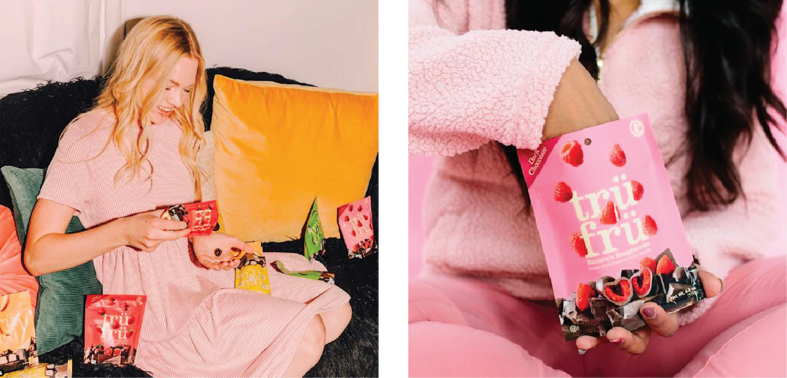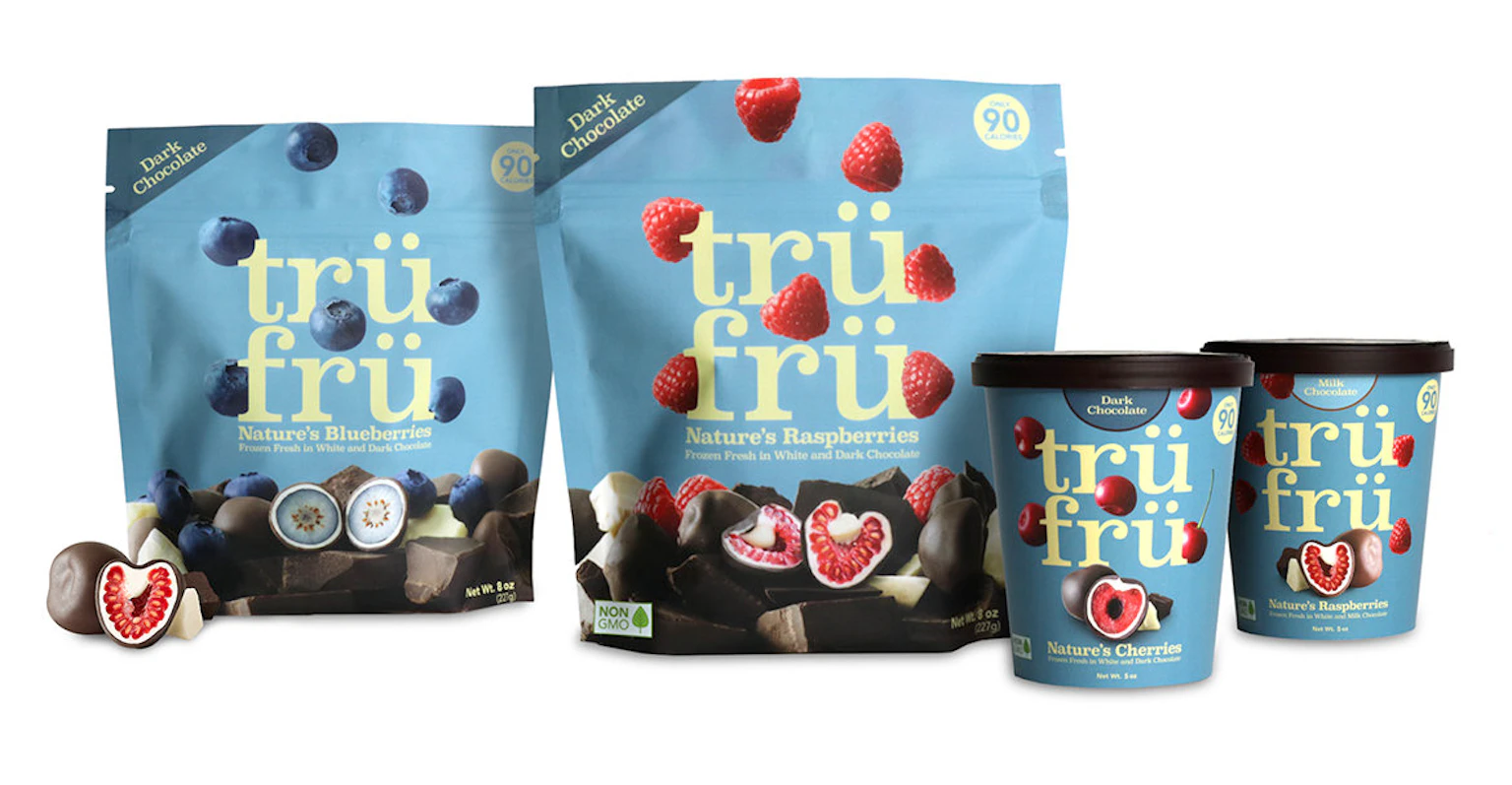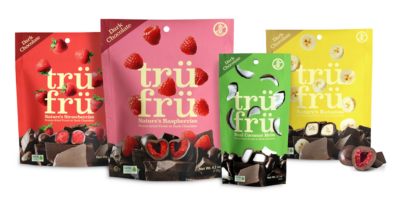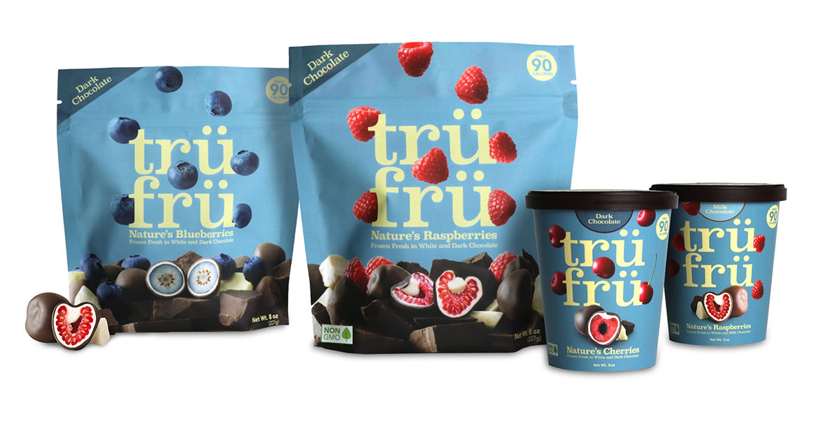 As one of the scarce brands in the category that uses 100% real fruit, Tru Fru needed its packaging to match the quality and purity of its top-shelf chocolate-coated fruit snacks. We worked with Tru Fru to develop a package design that clearly defined their product and place in the novelty category while dialing up taste appeal by championing the fresh fruit itself. Wait, True. Fruit. Tru Fru. I get it now.